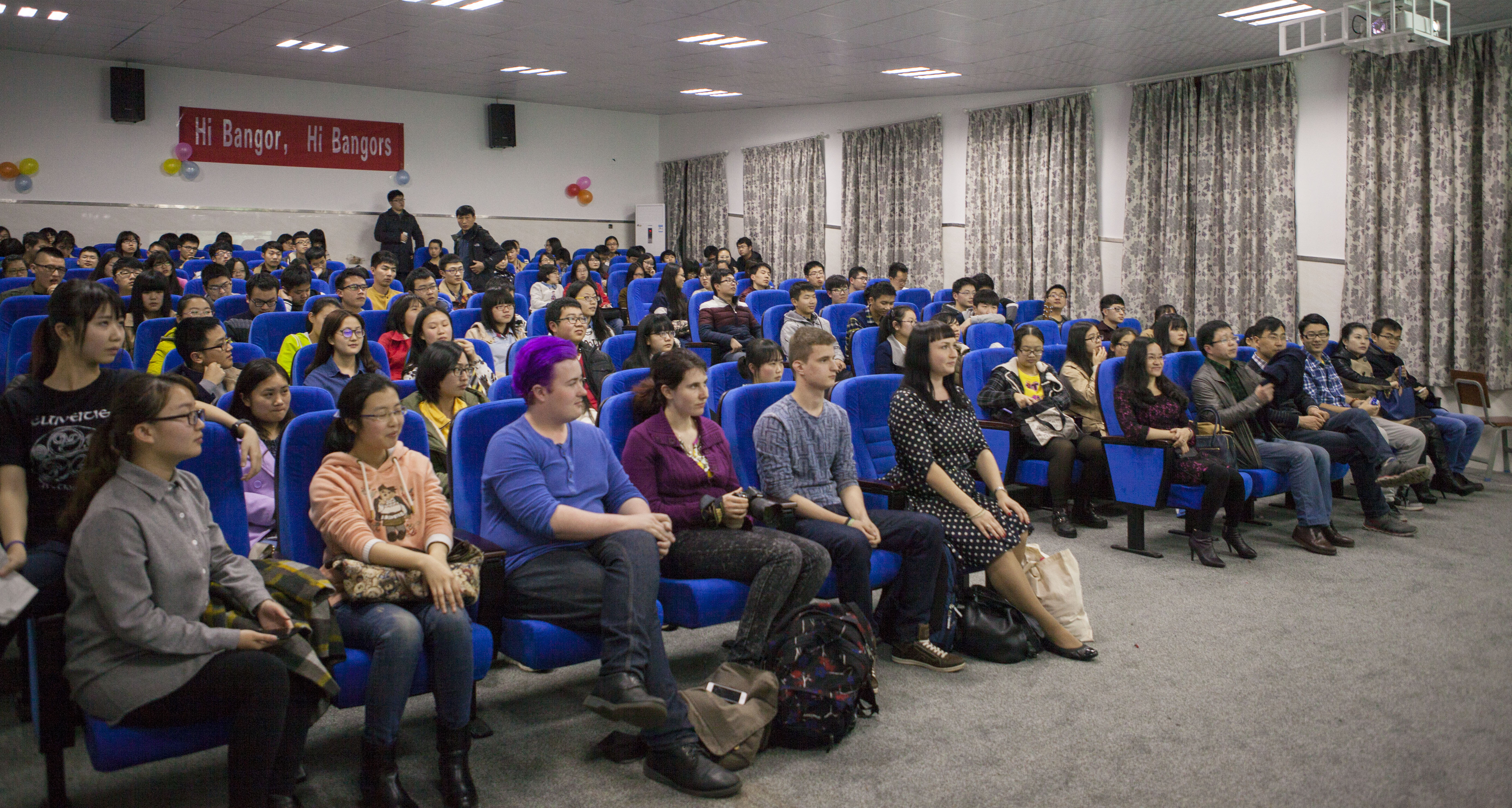 班戈大学文化挑战赛获胜团队(Katerina,Julian,Alexandre,Jake)共四人于2015年3月27日到达中南林业科技大学班戈学院。当日下午,他们在班戈学院代表的陪同下随堂听课、参观校园、并参与视频会议。当晚,该团队参与了由班戈学院方举办的中英师生交流会。