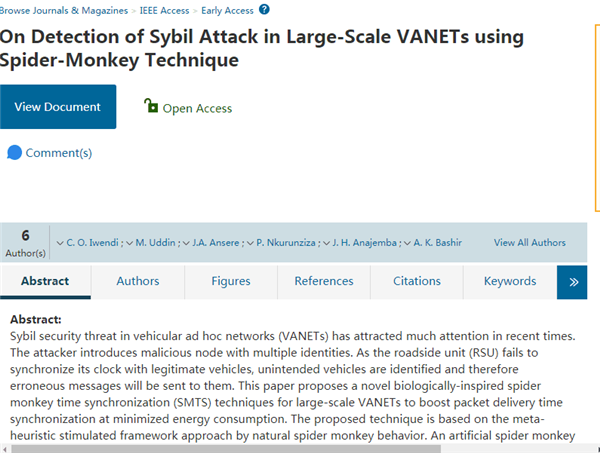 近日,我院电子信息工程教授瑟莱斯汀· 温迪(Celestine Iwendi)博士以第一作者身份在SCI收录期刊IEEE Access上发表题为《利用蜘蛛猴技术检测大规模车联网中的女巫攻击》(On Detection of Sybil Attack in Large-Scale VANETs using Spider-Monkey Technique)的研究论文。