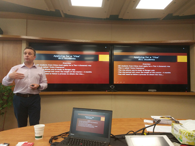 今年,我院有60多名2014级学生自愿选择了2+2培养模式,将于今年9月转换校区至班戈大学学习。为了方便学生顺利申请到英国留学签证,学院专门成立了校区转换学生签证指导小组。5月23日,班戈大学留学生服务中心主任艾伦·爱德华兹先生应邀前来为即将转换校区的学生介绍英国留学签证标准,并协助同学们启动网上签证申请程序。