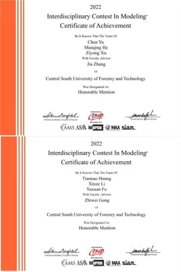 我院黄天诺、李欣泽、付宇轩、于晨、续子雍和何曼青同学组成的两支参赛队伍,在2022年美国(国际)大学生数学建模竞赛中均获得了二等奖的好成绩!