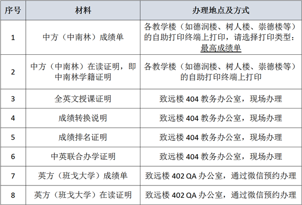 提示:(1)除了自助打印终端打印的自带中南林教务处公章的中方(中南林)成绩单和学籍证明(材料1和2),其余材料均需加盖开具材料的办公室公章方可生效。