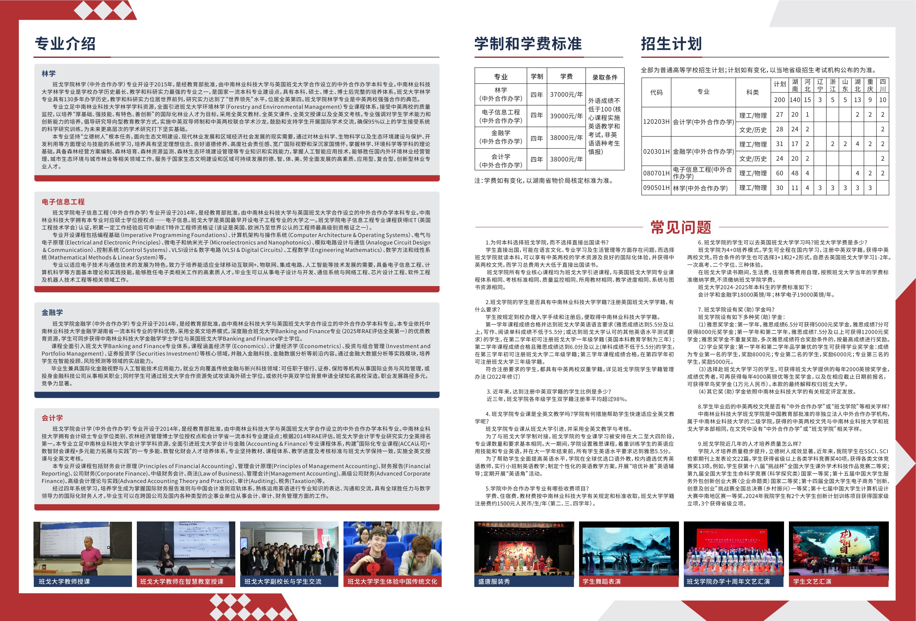 班戈学院金融学(中外合作办学)专业开设于2014年,是经教育部批准,由中南林业科技大学与英国班戈大学合作设立的中外合作办学本科专业。本专业依托中南林业科技大学金融学湖南省一流本科专业的学科优势,采用全英文培养模式,深度融合班戈大学Banking and Finance专业(2025年RAE评估全英第一)的优质教育资源,学生可同步获得中南林业科技大学金融学学士学位与英国班戈大学Banking and Finance学士学位。